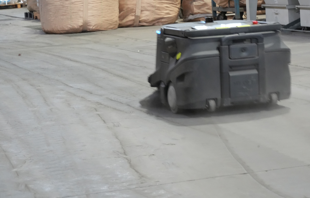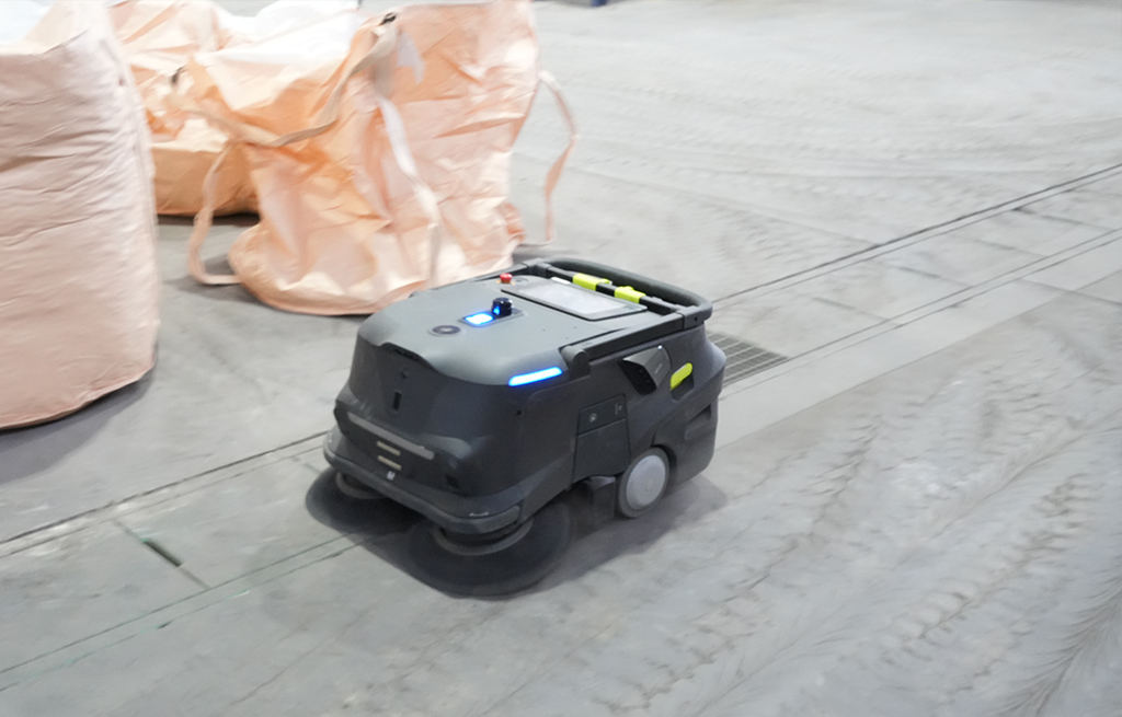 フォークリフトや人が行き交う日中を避け、夜間に稼働させることで、安全性を確保しながら広大なエリアの清掃を完了させています。